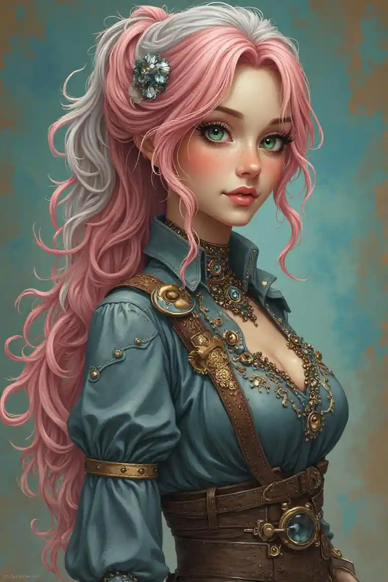 (masterpiece), masterpiece。one woman。 pink hair , silver hair , long curly hair ponytail 。 green eyes. cute steampunk cowgirl outfit blue and gold coloring 。vtu