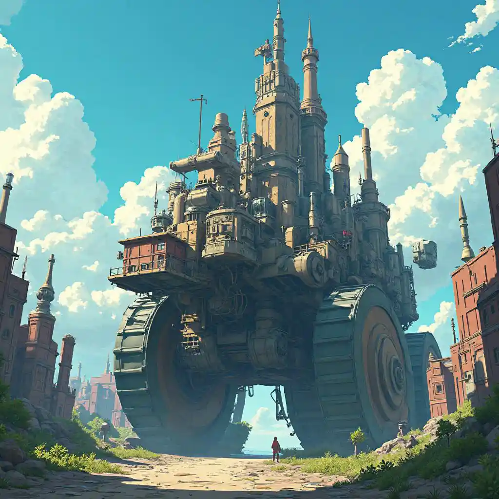 Mechanical city moving on colossal wheels, steaming engines, in a mecha-steampunk anime style.