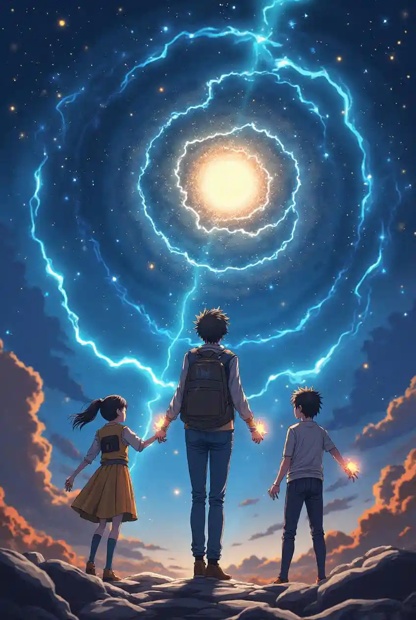 Bustling academy in a meteor, students harnessing star magic, resonating with cosmic anime themes.