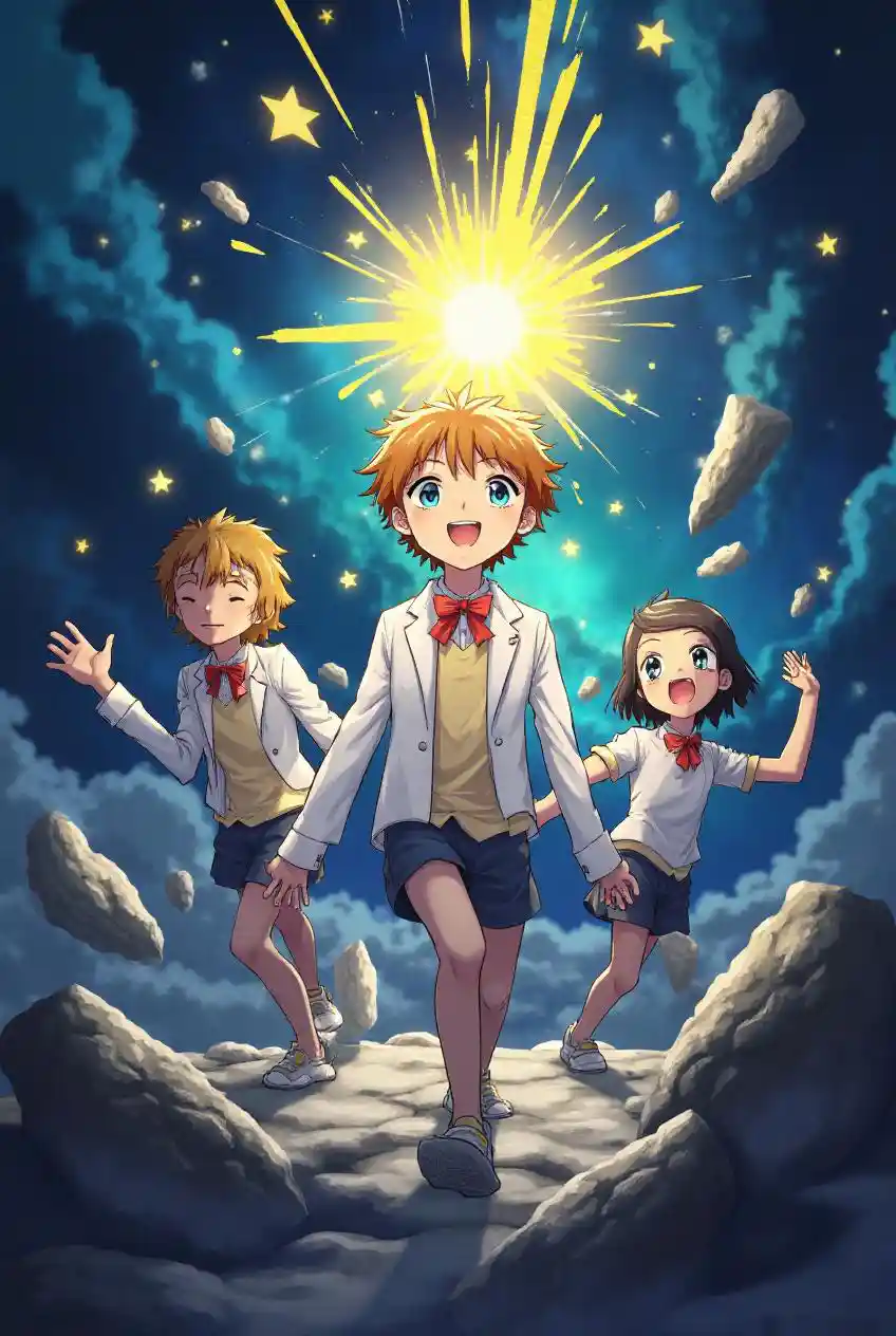 Bustling academy in a meteor, students harnessing star magic, resonating with cosmic anime themes.