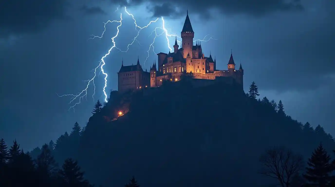 A grand castle's silhouette illuminated by lightning, atop a craggy hill.