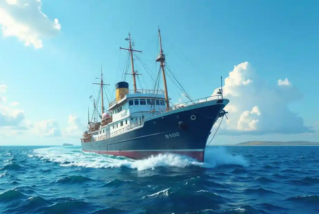 Victoriamasterpiece、HD、High Quality、4K、blue sky、horizon、The open sea、slightly ruffled、land can be seen slightly in the distance、large ship that almost sank、an elderly c