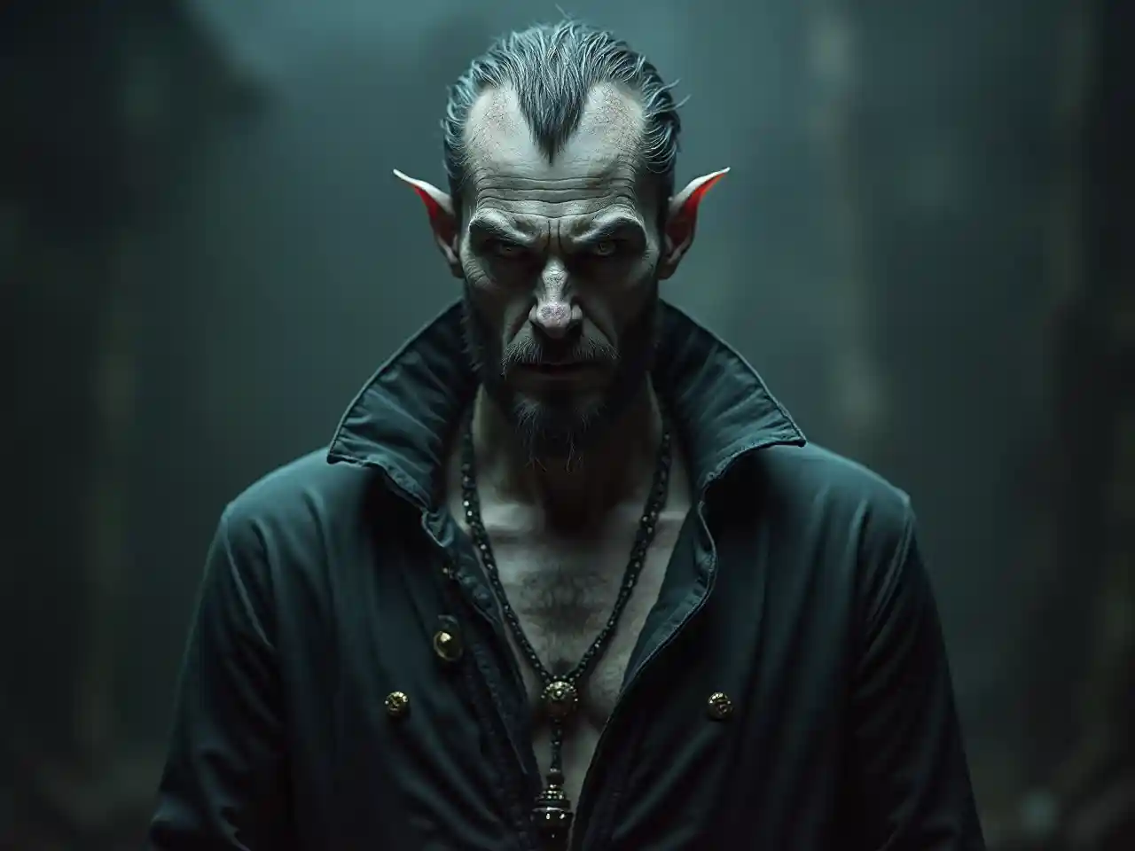 Terrifying ancient male Strigoi vampire, horror-themed, incredibly detailed, high dynamic range lighting, intense and dramatic shadows, brooding atmosphere, imposing figure with gaunt features and piercing eyes, tattered centuries-old clothing, archaic jewelry, set against a dark, misty background, capturing a chilling sense of dread and supernatural allure.
