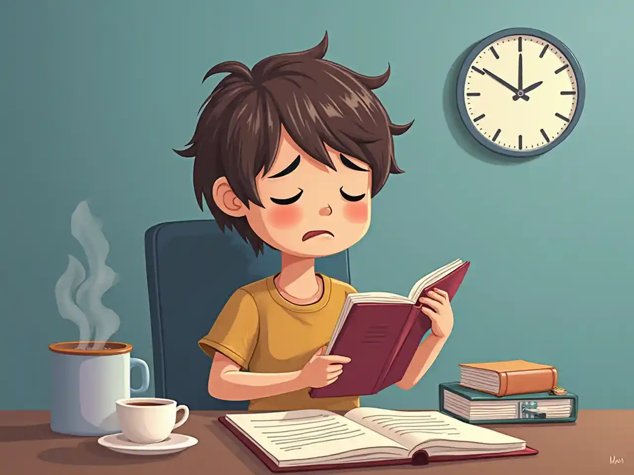 "Create an emoji of a student looking exhausted but determined after studying for 24 hours straight for exams. The student should have messy hair, tired eyes with bags under them, and be holding a thick textbook. They should be surrounded by coffee cups, papers, and notes, and there should be a clock showing the time ticking away, indicating the long study hours."