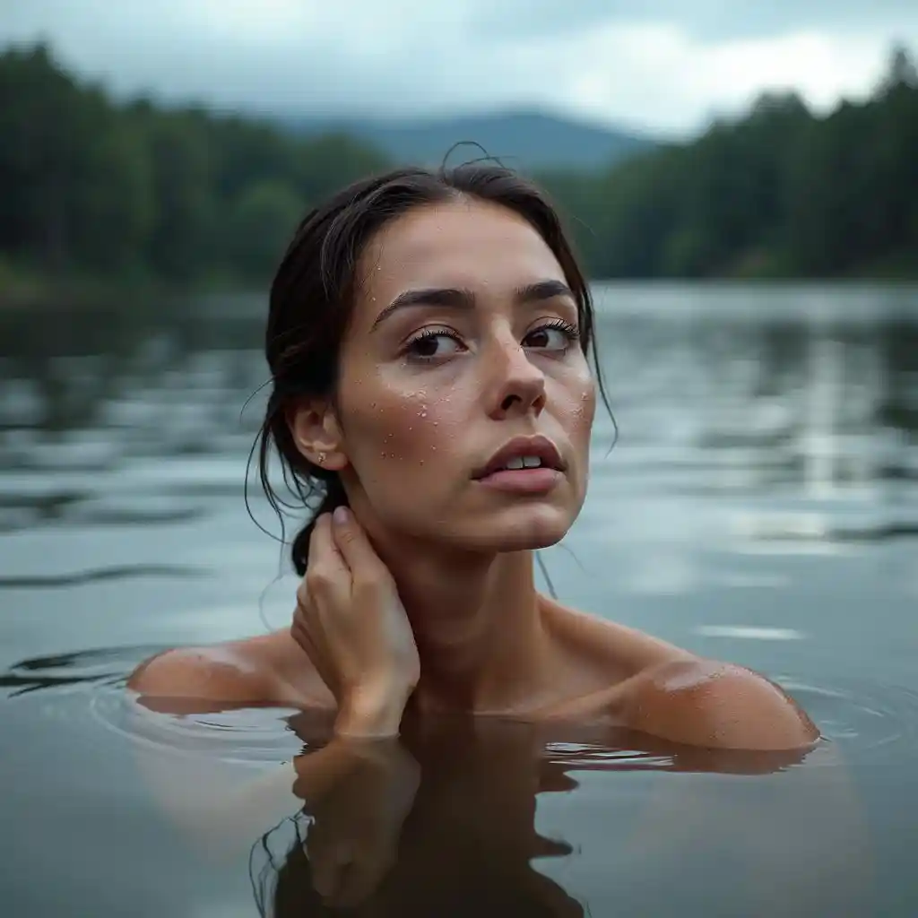 A woman submerged up to her neck in calm waters, with a serene backdrop of a forested area and a cloudy sky. Her face is partially visible, with water droplets clinging to her skin, and she gently places her hand on her neck. The lighting casts a soft glow on her face, emphasizing her features.