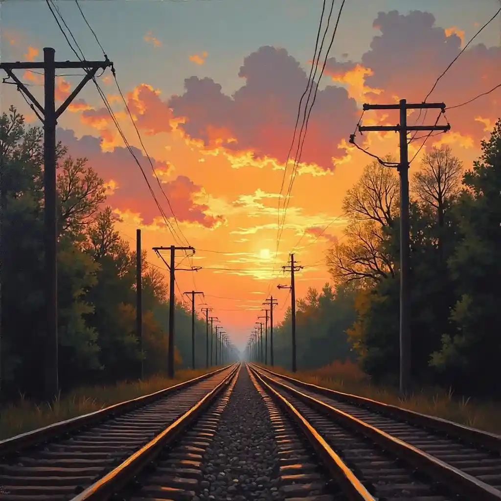 a sunset view of the sky over an electric line, with trees and train tracks in foreground, impressionist oil painting, visible brush strokes, vintage, warm color palette, late afternoon, evening light, atmospheric perspective, rule of thirds composition, golden hour lighting, vibrant colors