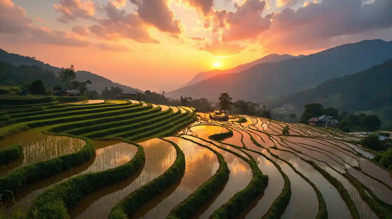 GrimTerraced rice paddies, reflecting the colors of a brilliant sunset.
