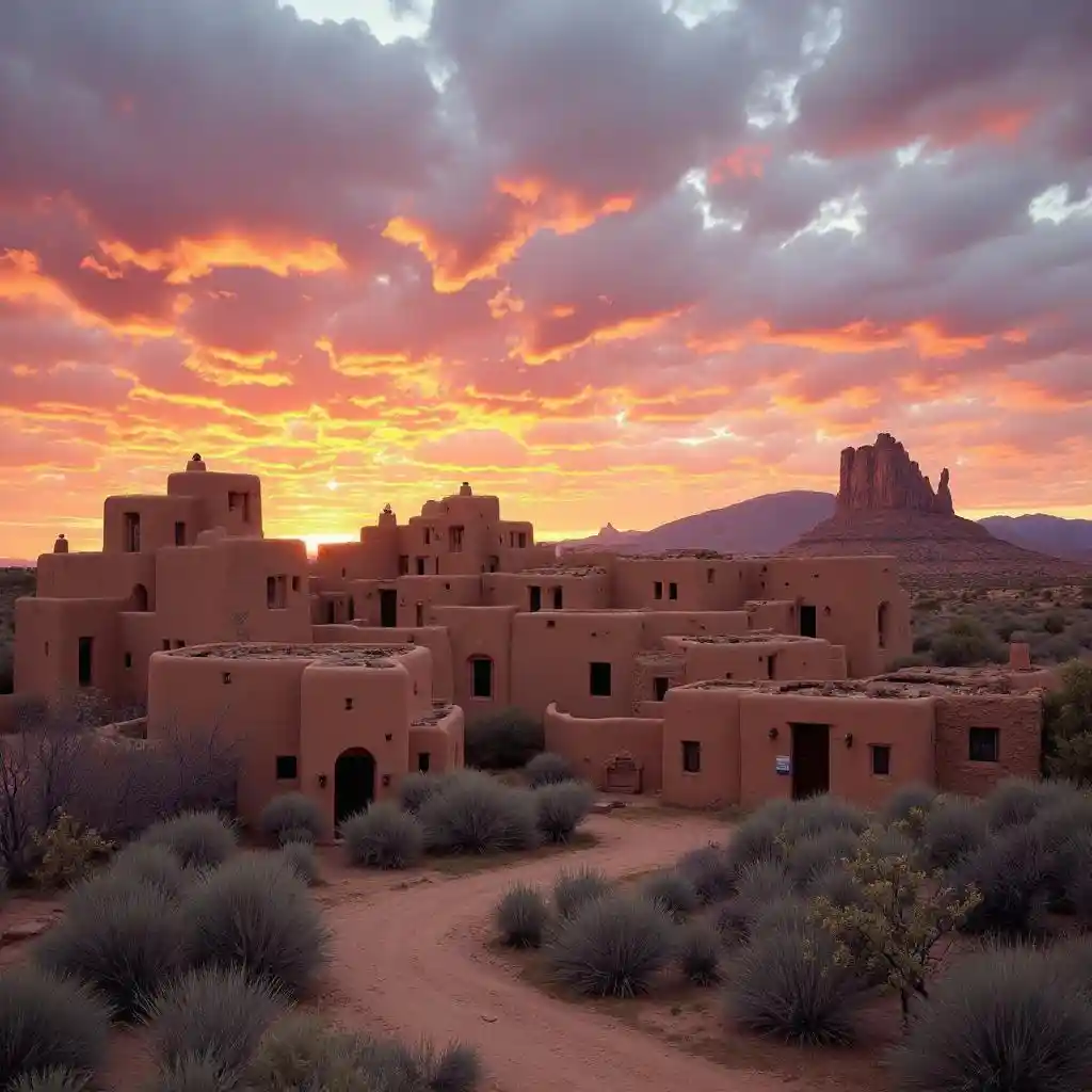 Adobe pueblos in New Mexico reflecting the palette of sunsets.