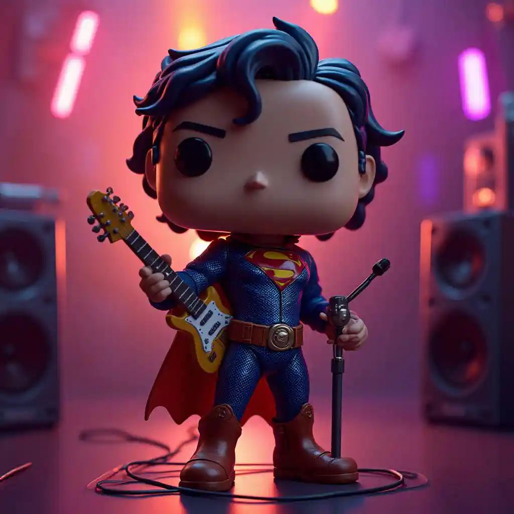 Funko pop character of SUPERMAN with purple And yellow thine line electric guitar hair 70' outfit and a microphone and a big Speakers in the background, as a full body Funko pop!, as a Funko pop!, fanart, detailed fanart, added detail, Funko pop, highly detailed exquisite fan art--volumetric lighting, detailed 64K Sony A7S III, f/ 8. 0, 1/ 200, sharp focus, detailed 64K, volumetric lighting, shot on Sony A7S III, f/ 9. 0, 1/ 500, sharp focus 64k unsaturated , masterpiece, best quality, ultra detailed sharp focus, dramatic, award winning, cinematic lighting, , volumetrics dtx, (film grain, blurry background, blurry foreground, bokeh, depth of field, sunrise, interaction, Perfect chainmail)--photorealistic, (best quality 128k,highres,masterpiece:1.2),ultra-detailed,(realistic,photorealistic,photo-realistic:1.37),realistic skin texture,{{{ UHD detailed eyes}}}