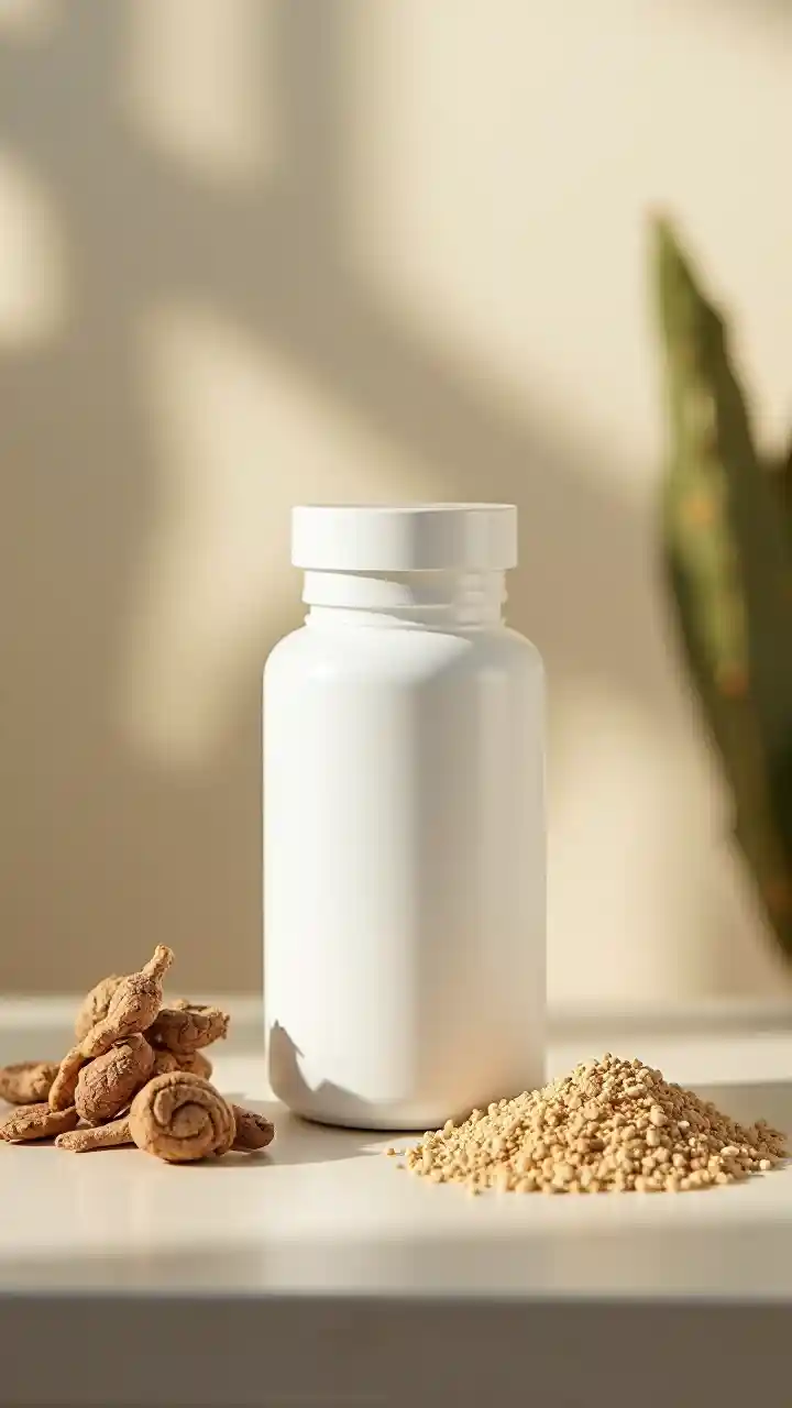 white supplement bottle smooth thin white cap mockup with beautiful background behind it. Supplement bottle mockup with the following ingredients (in powder form or natural form) beside it on a table: KOREAN GINSENG ROOT EXTRACT, CISTANCHE DESERTICOLA, PTEROSTILBENE, ASTRAGALUS, CORDYCEPS, and ASHWAGANDHA ROOT. Longevity