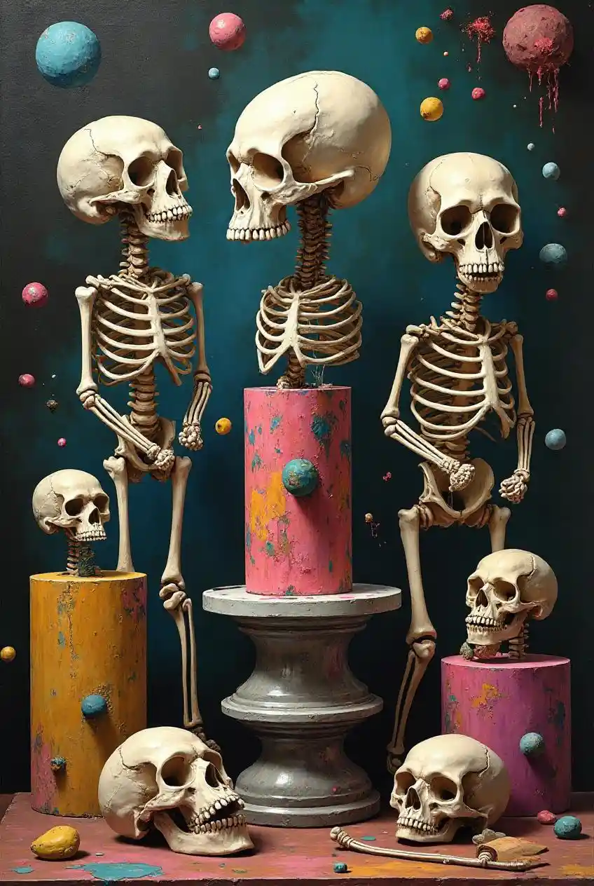 Jacobbasquiat style still life, alchemist lab, monkey skulls, animal bones, pedestals, abstract escher, melting skeletons and melting prisms, surreal salvador dali