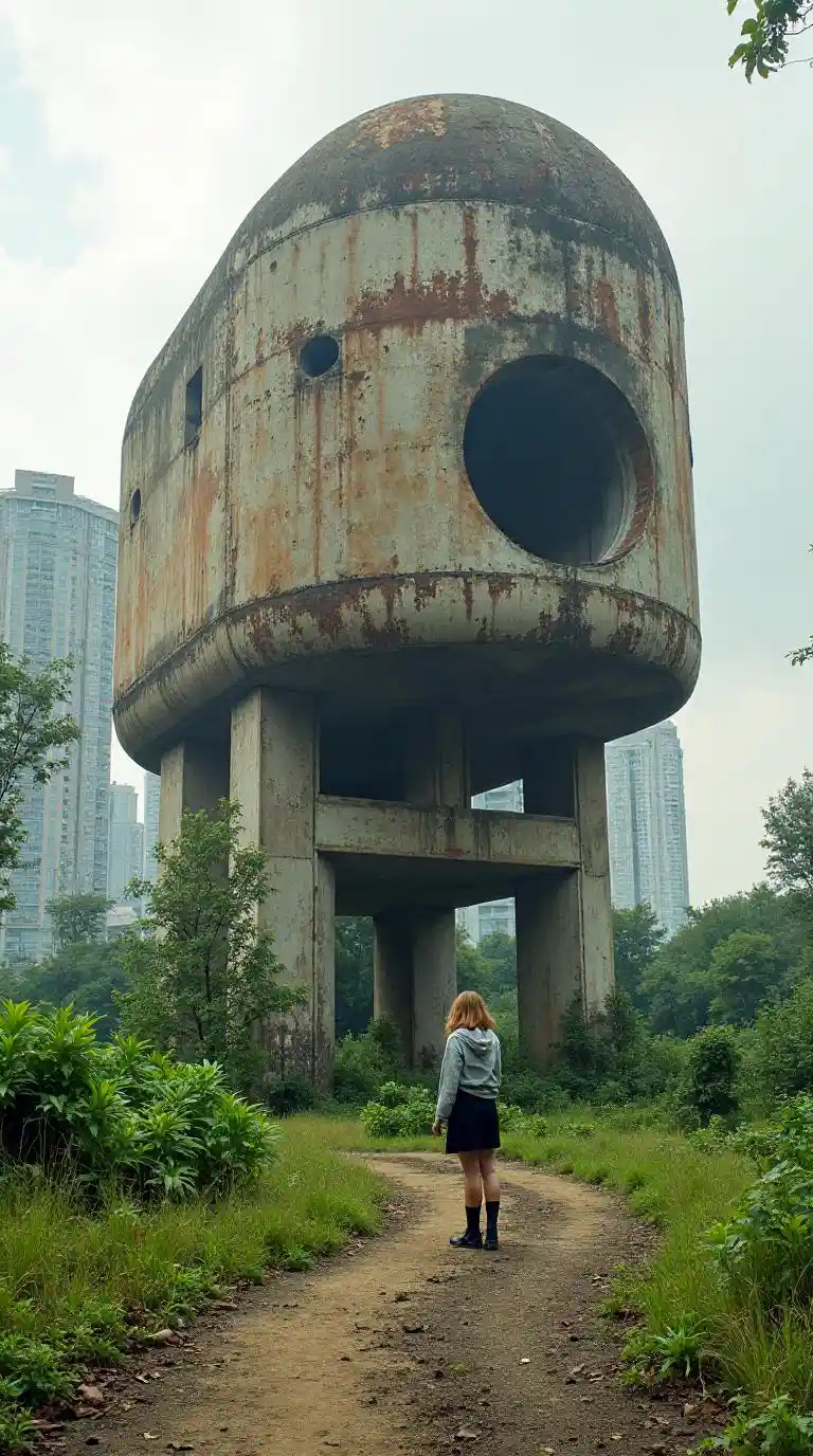 people standing and looking into far distance. foreign alien planet. rouge exploration adventures visit a these eerie abandoned overgrown landscape buildings. A photo of an old, abandoned, rusty concrete brutalism building with a Bauhaus style. The building has a alien-like structure with a large, round window. The background contains a city with tall, modern buildings. The photo has a surreal, dream-like quality.