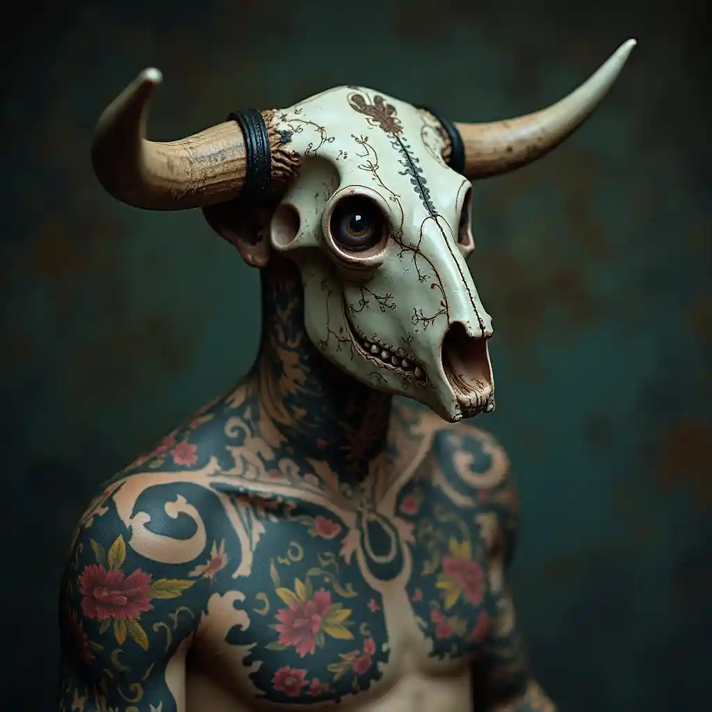 Surreal Tattooed Bull Skull Helmet Cinematic Photo