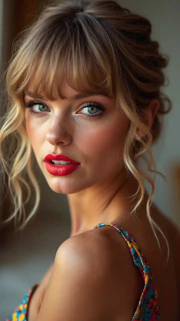 Portrait of Taylor Swift, bright and saturated colors, elegant, highly detailed, vogue, fashion magazine, sharp focus, bright expressive makeup, dramatic lighting, depth of field, incredibly high detailed, blurred background