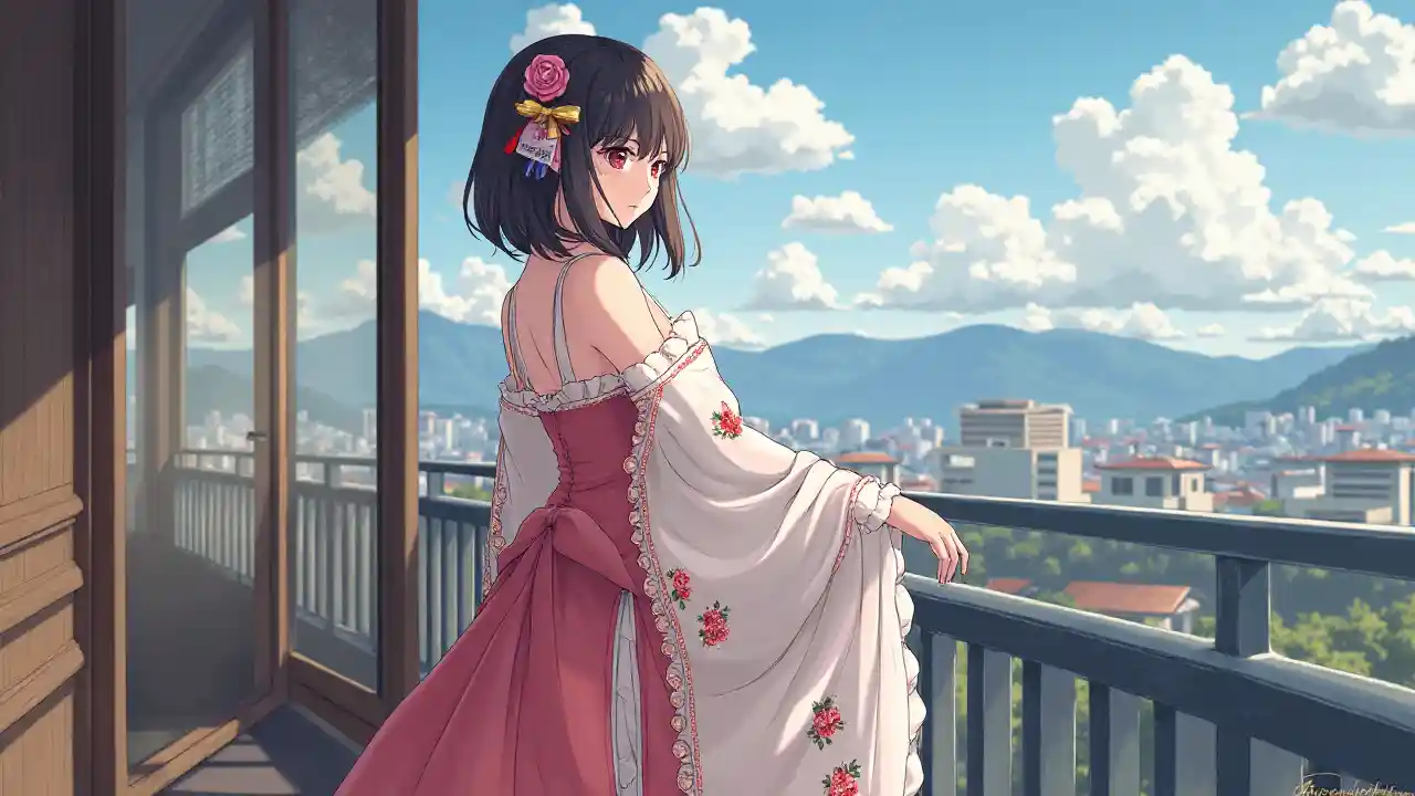 AubreyTanaka hitomi wearing fancy dress, standing by balcony