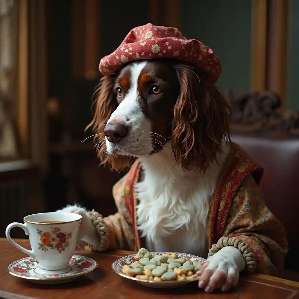 Springer Spaniel Drinking Tea in Fancy Clothes