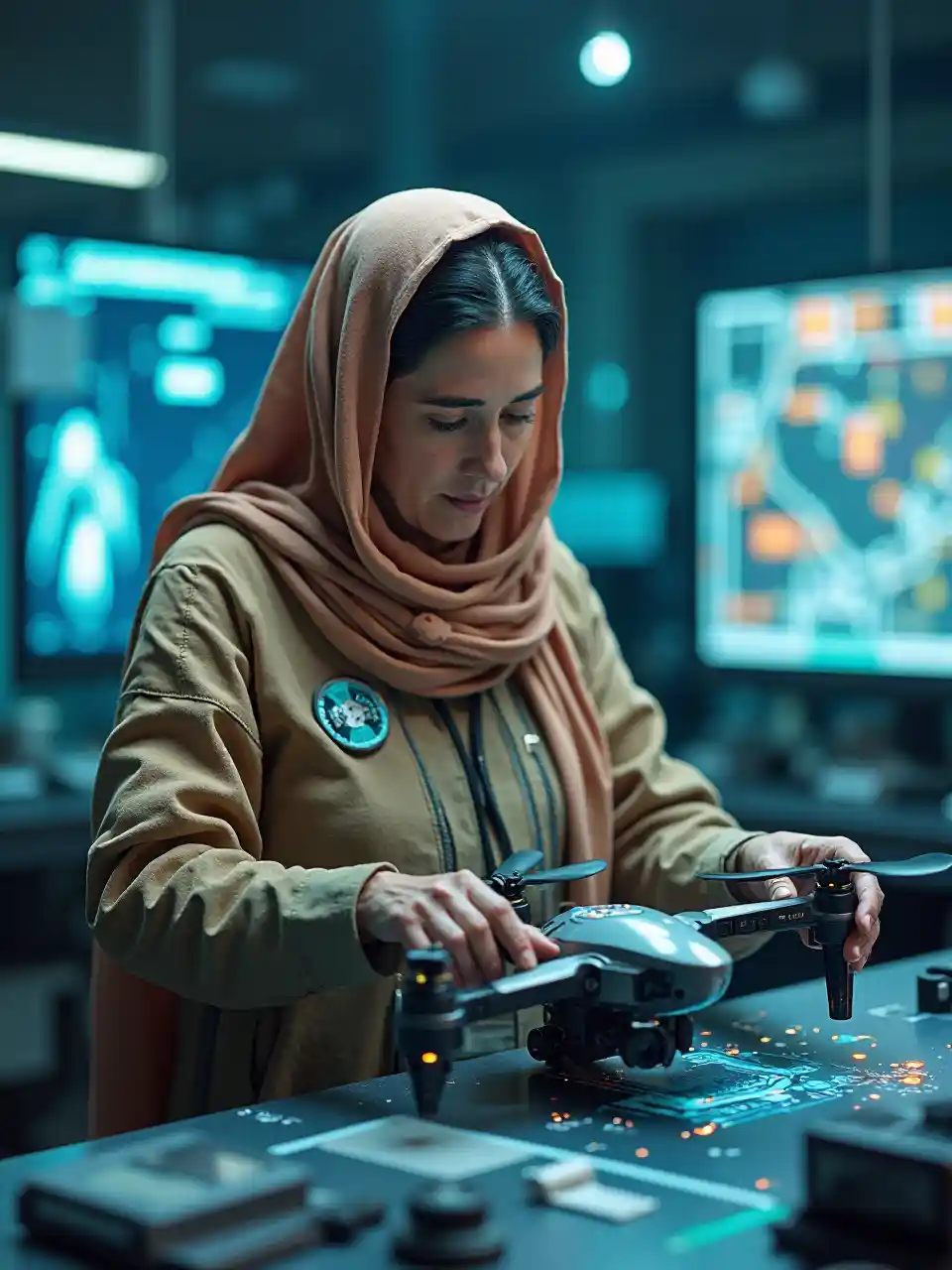 Repairing a drone in a futuristic lab, a 82-year-old Middle Eastern woman with a shawl wears a jumpsuit with circuit patches. Holographic screens and buzzing bots frame her, her focused tweaks radiating intellect and innovative spark in a high-tech scene. Her hands shape tomorrow.