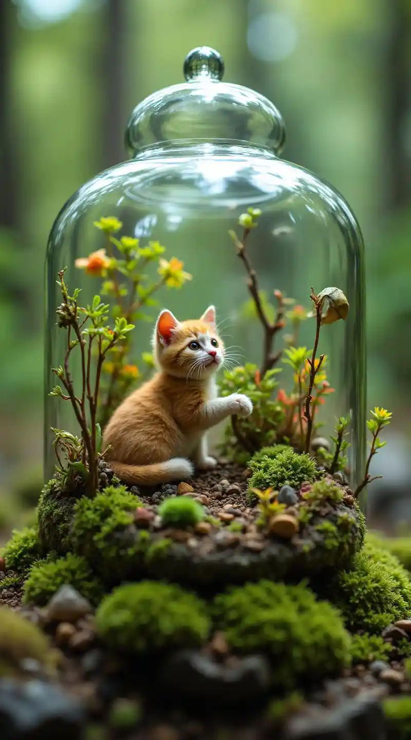EleanorA microscopic fantasy world hidden inside a terrarium, terrarium with mosses and plants showing a micro bio diversity, and there lives a micro girl with kitten