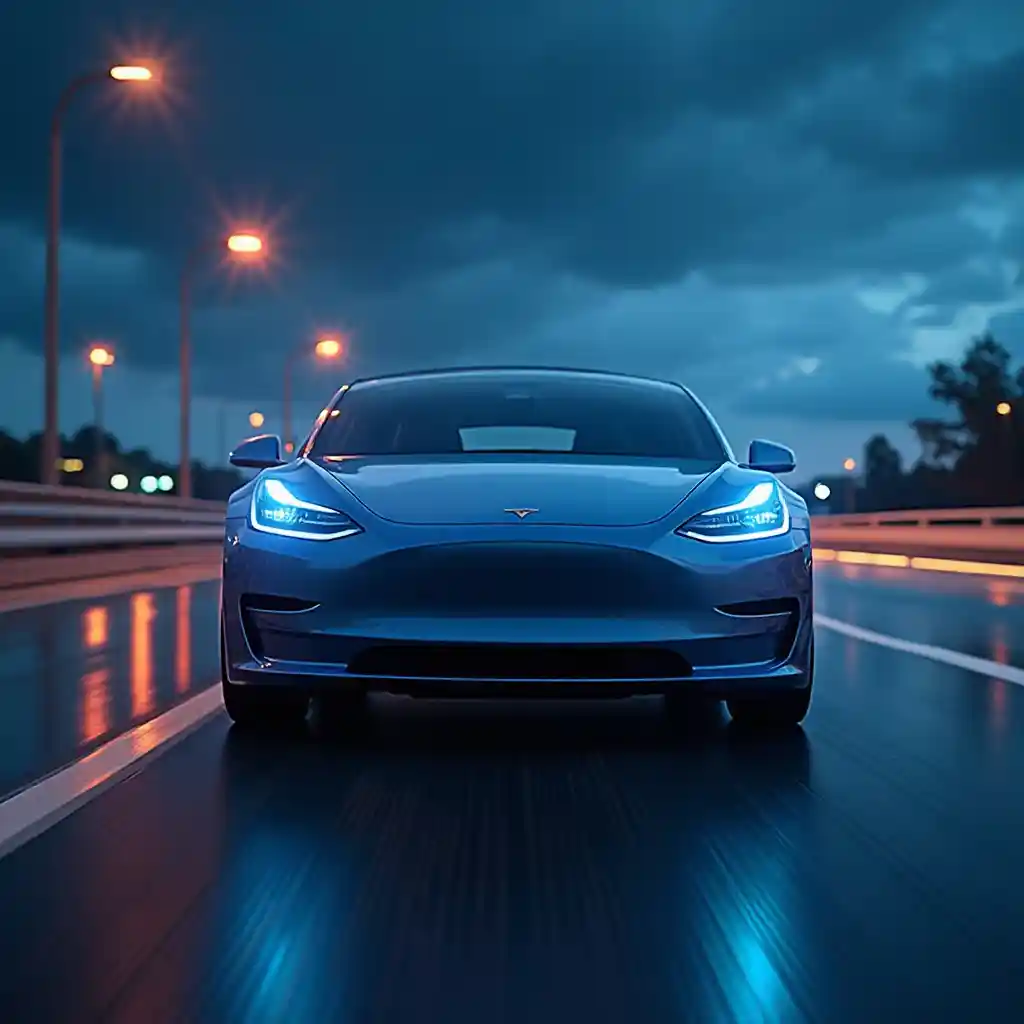 Kinsleyfocusing on the front part of the car and the headlights, render a highly detailed, clean, tesla car speeding on highway from right to left with blue neon lights, blue headlights