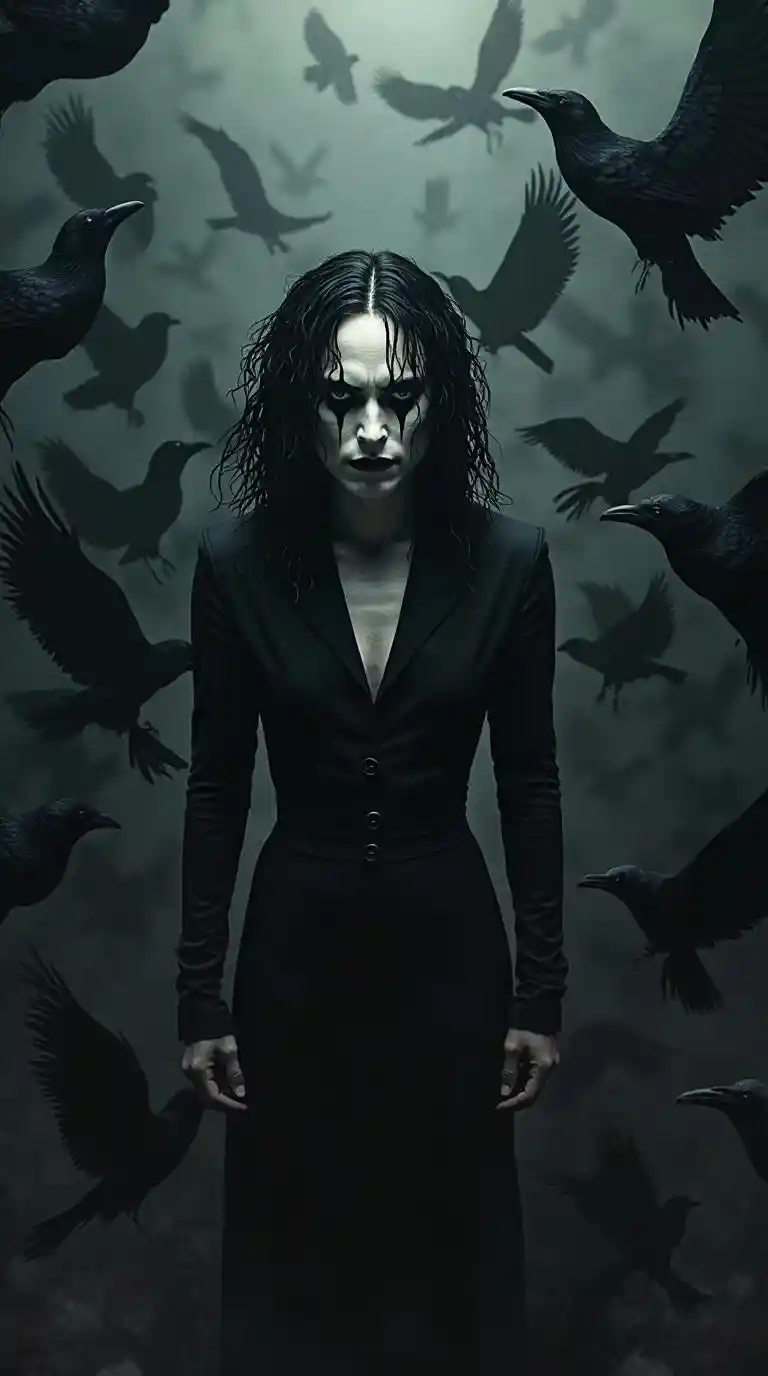 Brandon Lee: The Crow, sf, intricate artwork masterpiece, ominous, matte painting movie poster, golden ratio, A pale-skinned figure with Joker make up with Black long wet hair gazes directly at the viewer from the center of a swirling mass of dark birds, likely crows or ravens. The atmosphere is moody and surreal, with a limited color palette dominated by blacks and deep grays, creating a sense of confinement and mystery. The figure wears a form-fitting, dark outfit that blends into the surroundings, emphasizing the contrast between their fair skin and the dark feathers surrounding them.