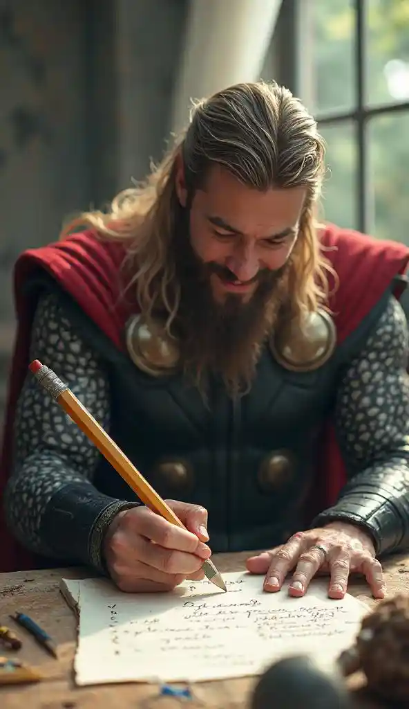 EastonThor is writing with a enormous pencil, the pencil's end part has thor's square iron hammer. He is smiling while writing. He is looking at the paper in which he