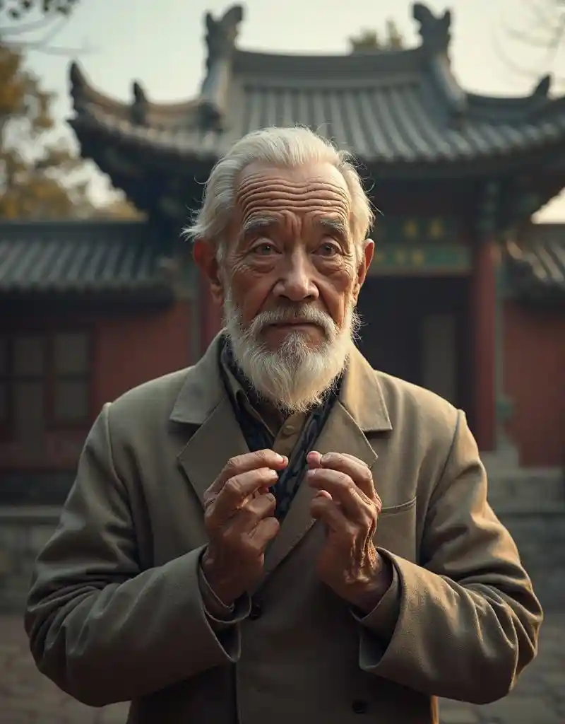 An old man against the background of the oriental pavilion, thoughtful look, expressive facial expressions, anatomically correct hands, finely stylized hair, be