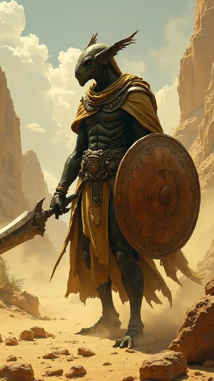 A thri-kreen wielding a 1H weapon and a shield, standing in the deserts of the Dark Sun world