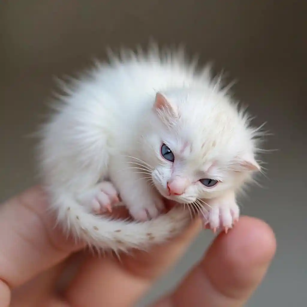 A white cat with miniature gray spots, the size of a pea, curled up with blue eyes peacefully on the tip of a human finger. Its soft, white ears highlight its delicate appearance. The hand holding the cat gently contrasts its small size with the detailed texture of its fur. A softly blurred background emphasizes the calm, intimate scene between the cat and the finger.
