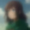 Attack on Titan screencap of a female with medium length brown wavy hair with bangs, dark blue eyes, light skin , round long oval face , pink lips . Scenery is beautiful. she is wearing a green cloak. WIT Studios season 3 screencap.