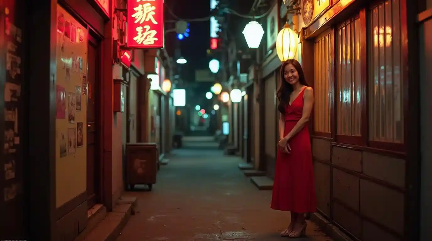 Two bars with small neon signs in the alleyways of Tokyo in the 1990's. The focus is on a young woman in a sexy red dress and pink gold-encrusted high heels near the camera. A young woman standing by the wall smiling and waving at the road, looking towards the camera, the street lights are dim, full of hedonistic atrophy, live action, iso 800, Rembrandt lighting, colour temperature 6400K, short shutter speed to enhance the sharpness of the image, Kurosawa style, sunny midday, depth of field is deeper.