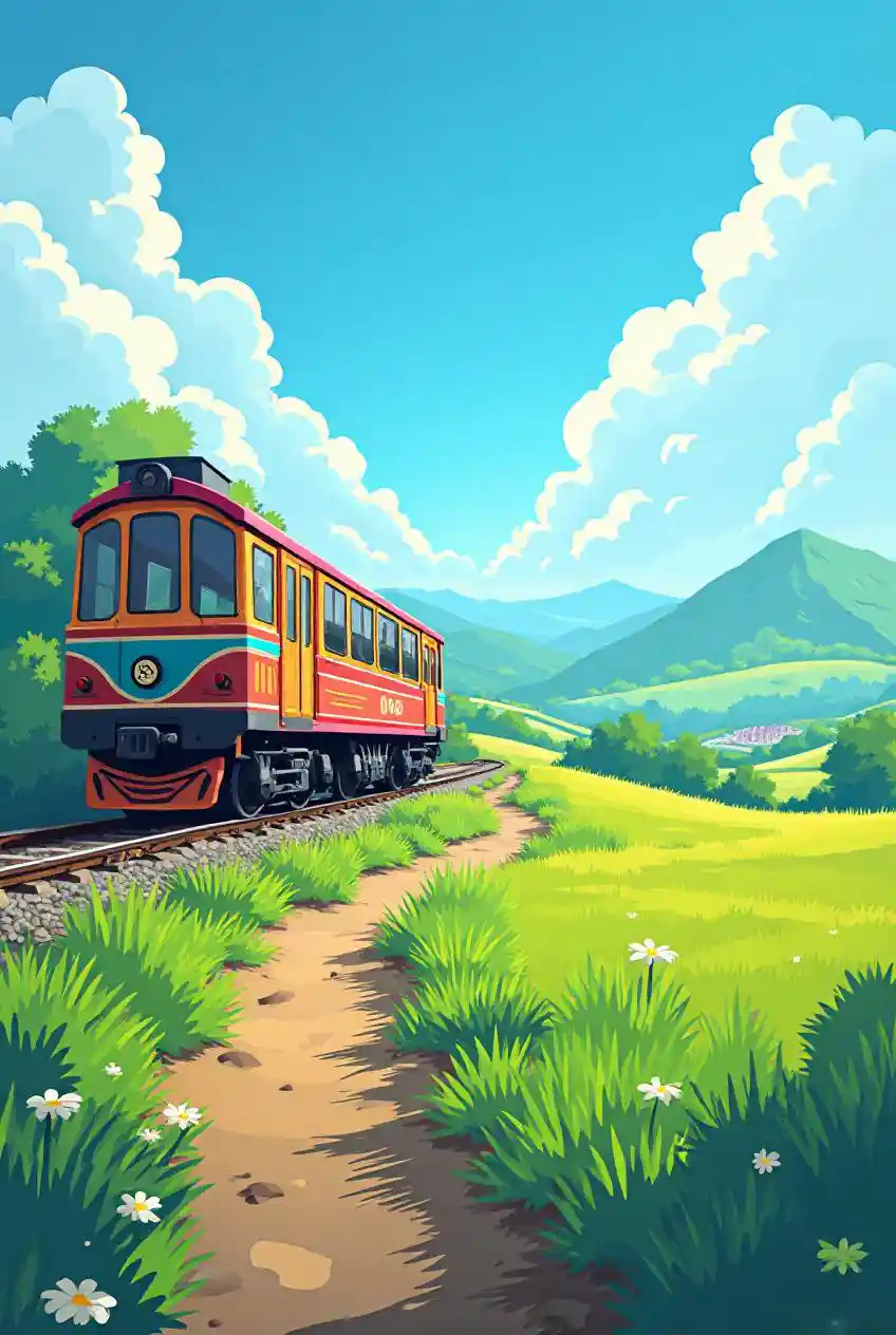 Adalyncolorful landscape with a blue sky and green grass. On the left side of the image, there is a train with colorful toonish . The train is in the center of the path and is moving towards the right side.