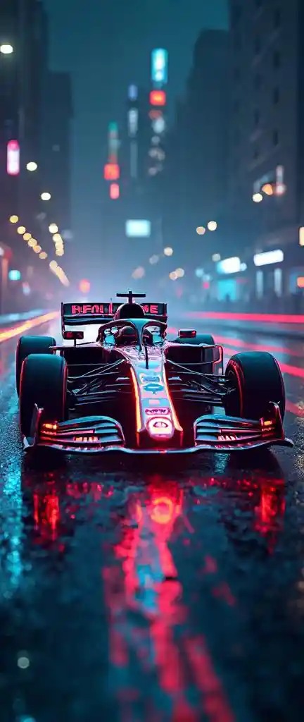 F1 RACE CAR with light streak behind it ala tron. TRON meets Madmax furyroad-chrome edition, mondern Chrome bodies, neon trails—engineer the hottest ride on