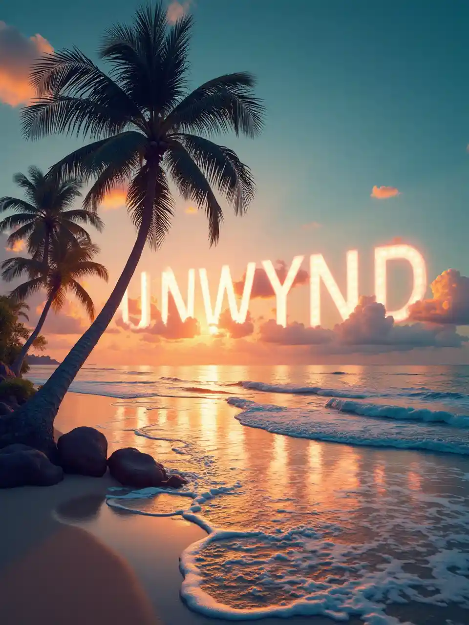 (accurately spelled text "UNWYND"), palm tree, (luxurious) tropical beach, (breathtaking scenery), (sunset hues) blending warm oranges and serene blues, (inviting) calm waves lapping at the shore, (ethereal) clouds forming the text, (high resolution) 4K, (serene ambiance) exuding tranquility, (glossy texture), ideal for luxury ads, (immersive composition) capturing idyllic beauty.