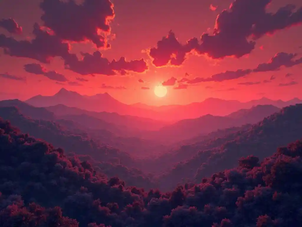 OliviaA realistic photographic landscape. A crimson-tinted twilight sky, a gradation of crimson spreading towards the horizon, and countless shining crystalline islan