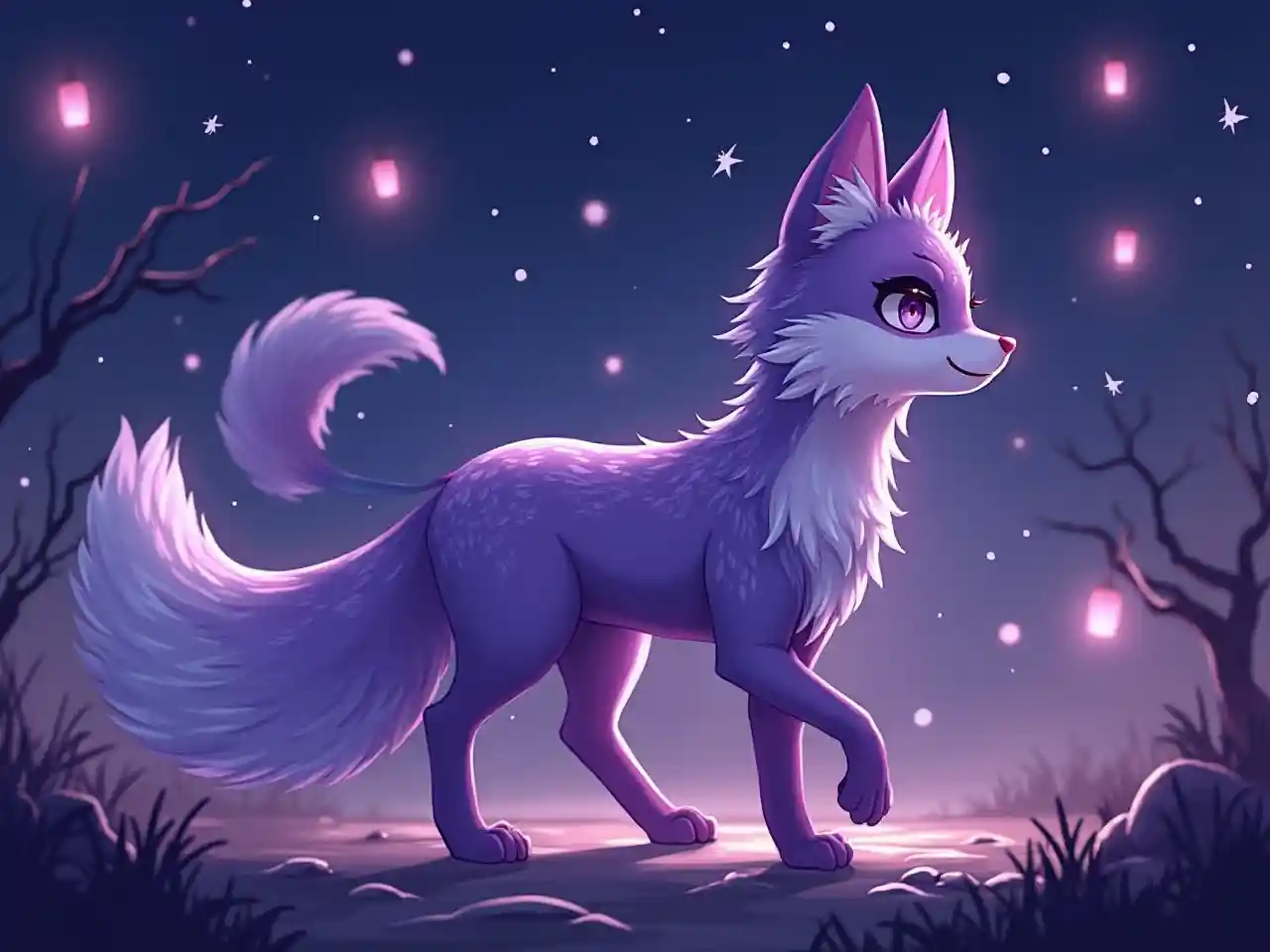 PianeerA fox-like kitsune with (((violet fur))) and soft (((lavender runes))). Its (((nine tails))) are behind it, glowing with shadowy light. It walks under stars and floating lanterns. Element: Twilight 🌒