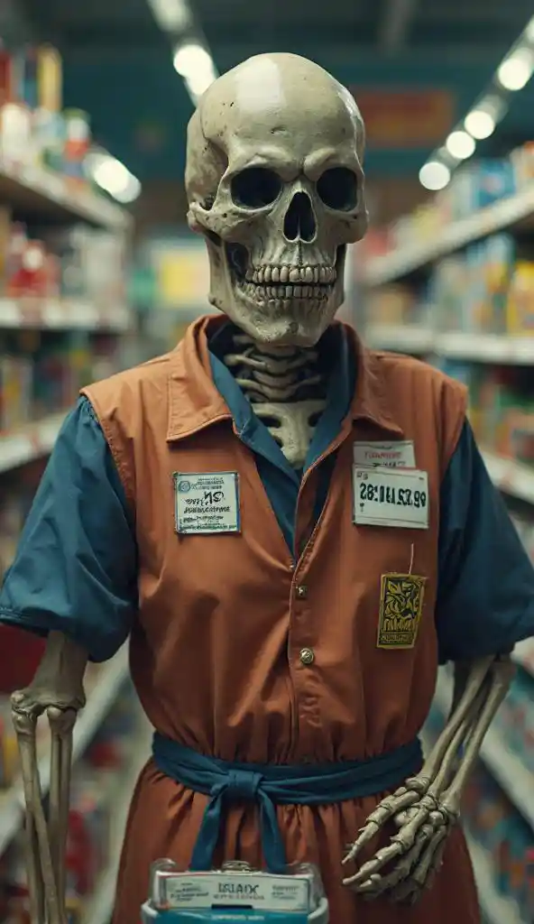Create a surreal and humorous cinematic scene featuring a skeletal warrior dressed in a modern convenience store uniform, complete with a name tag and branded a
