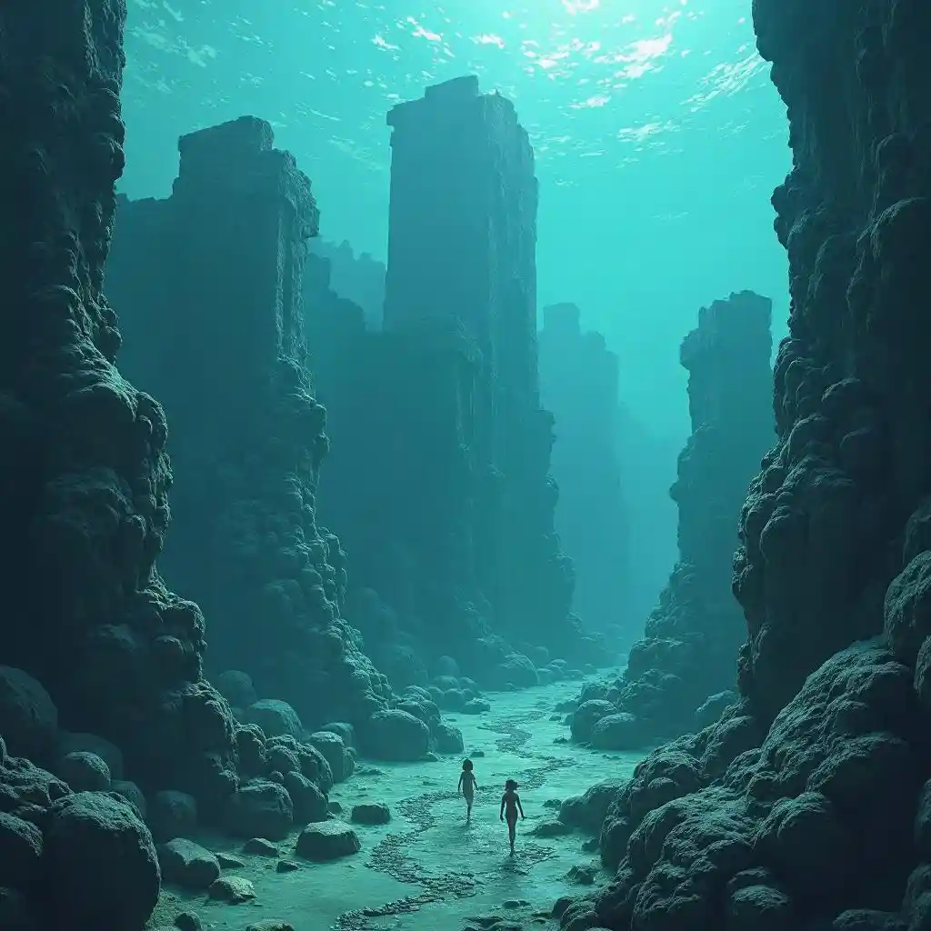 EastonDeep-sea city with merfolk and submerged ruins, channeling underwater fantasy anime.