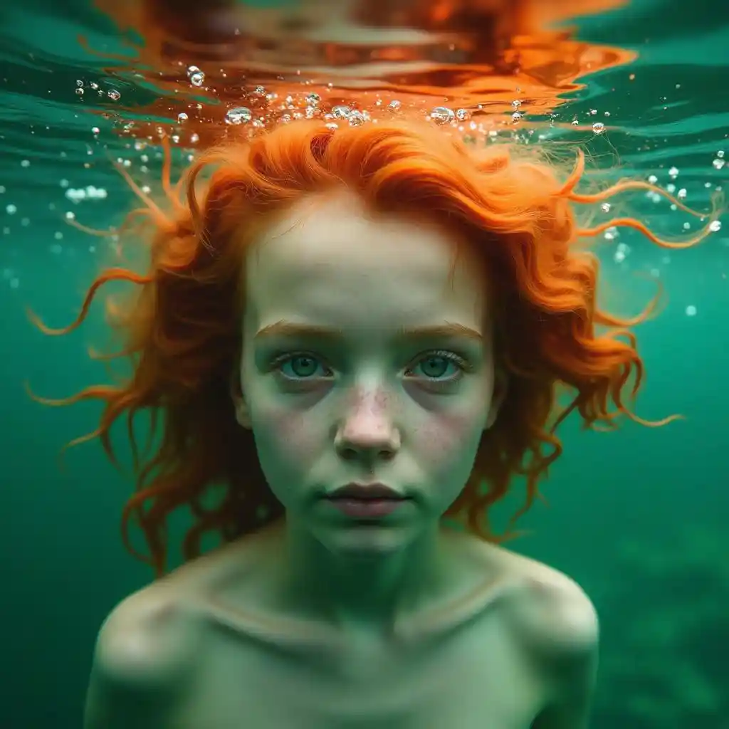 A girl with porcelain skin and striking red hair is underwater submerged in tranquil emerald waters. Their hair fans out in a halo of fiery strands against the serene backdrop. Eyes, clear and piercing, gaze directly ahead with an enigmatic calm, inviting wonder about the thoughts hiding behind them.