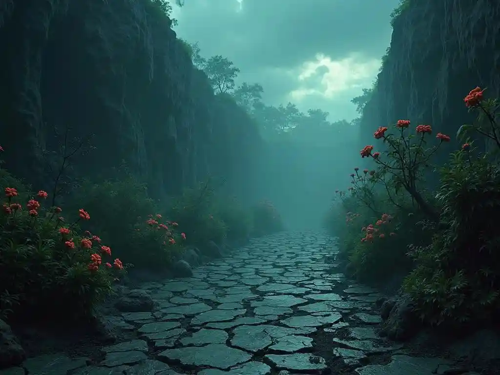 High-quality image. A place like a square in the underworld. A dark and eerie atmosphere with a damp feel. The ground is cracked, and strange plants that emit a