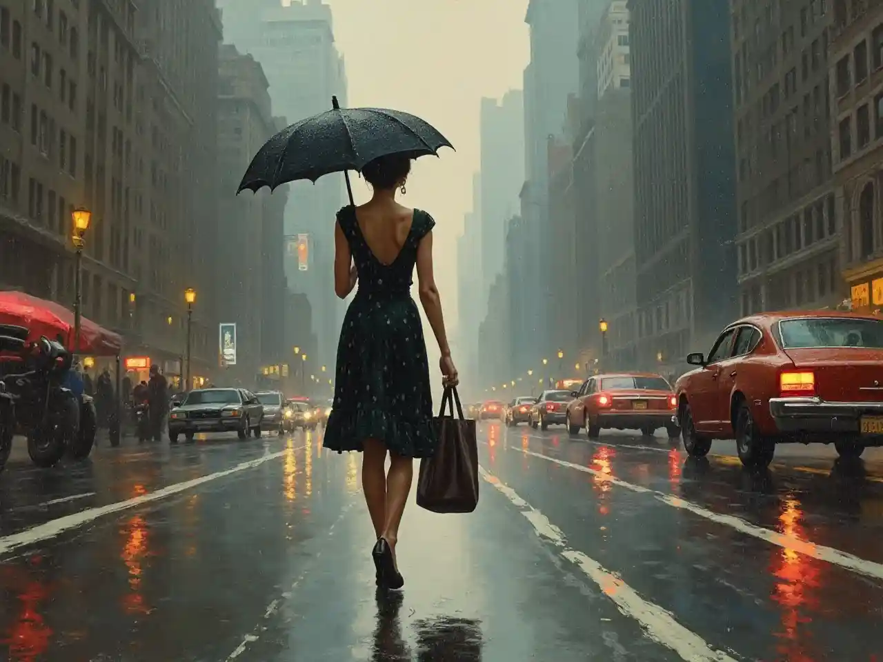 Camilaa woman in a dress and umbrella walking in the rain on a city street with cars, Art Frahm, american scene painting, kinkade, an art deco painting