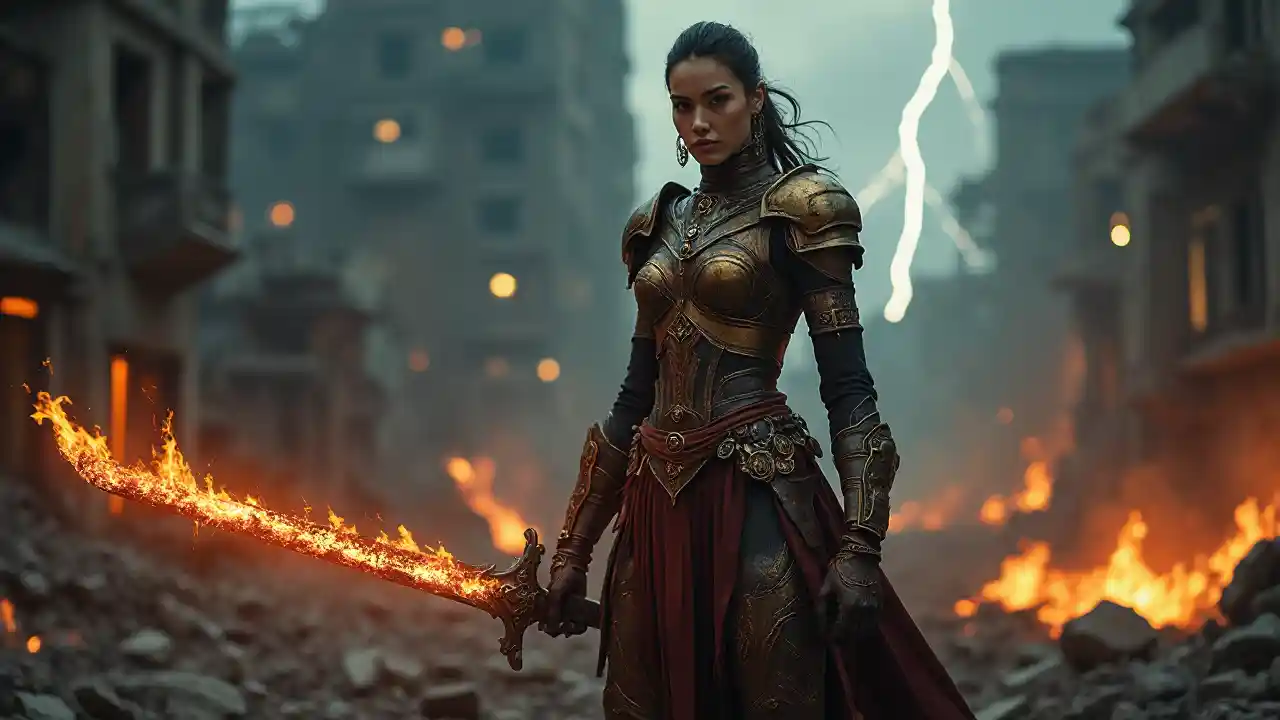 Amid a dramatic urban landscape ravaged by destruction, a fierce warrior stands confidently, clutching a fiery sword that casts an orange glow in the dim, smoky environment. Dressed in intricately designed armor that enhances her powerful presence, she exudes a blend of strength and beauty. The backdrop of crumbling buildings, punctuated by flickering flames and ominous storm clouds, evokes a sense of chaos and impending danger, as lightning silently cracks the sky. The composition effectively draws the viewer’s eye to her determined expression, highlighting her readiness for battle against the chaotic scene enveloping her. A striking balance of color, with deep hues emerging from the darkness and the stark contrast of fire, creates an intense and captivating atmosphere that tells a story of resilience amid turmoil.
