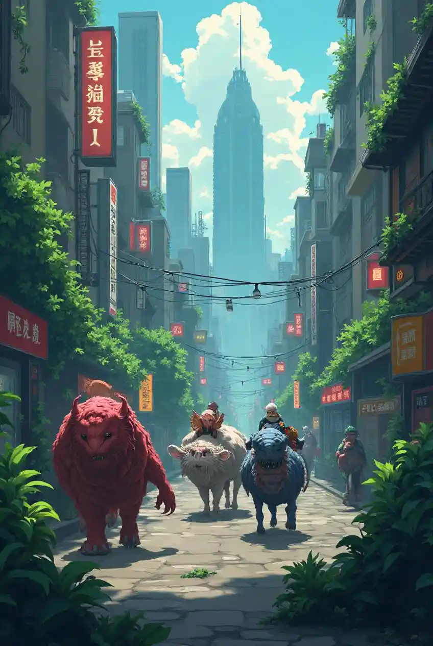 Urban jungle, street races with magical beasts, echoing urban fantasy anime vibes.