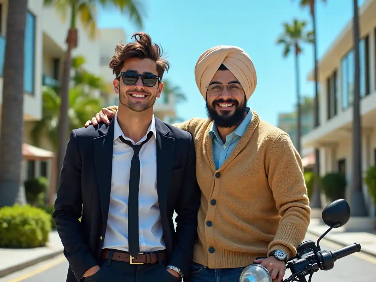 Under a bright blue sky, two young men stand side by side, exuding camaraderie and confidence against a backdrop of modern architecture and greenery. One, with tousled hair and fashionable sunglasses, sports a formal dark blazer and tie, while the other, wearing a traditional turban and a cozy sweater, leans casually against a motorcycle. Their smiles and relaxed postures suggest a moment of celebration or friendship, embodying a joyful atmosphere. The vibrant surroundings, with palm trees and a sunlit street, enhance the scene's inviting and lively mood, capturing a snapshot of youthful energy in an urban setting.