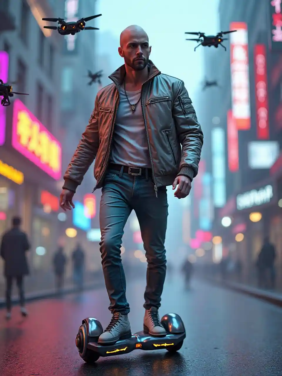 Riding a hoverboard through a futuristic city, a White man in his 25s shines in a sleek jacket. Neon signs and drones frame him, his bold moves radiating cutting-edge, urban charisma.