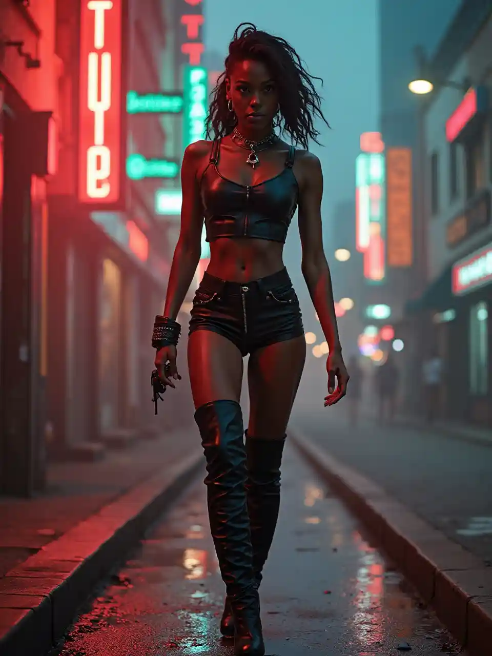 Strutting through a dystopian city, a Black woman in her 25s shines in a leather crop top and thigh-high boots with rivets. Neon signs and smoky air frame her, her toned legs and daring neckline exuding rebellious energy and urban sensuality in a gritty, futuristic scene.