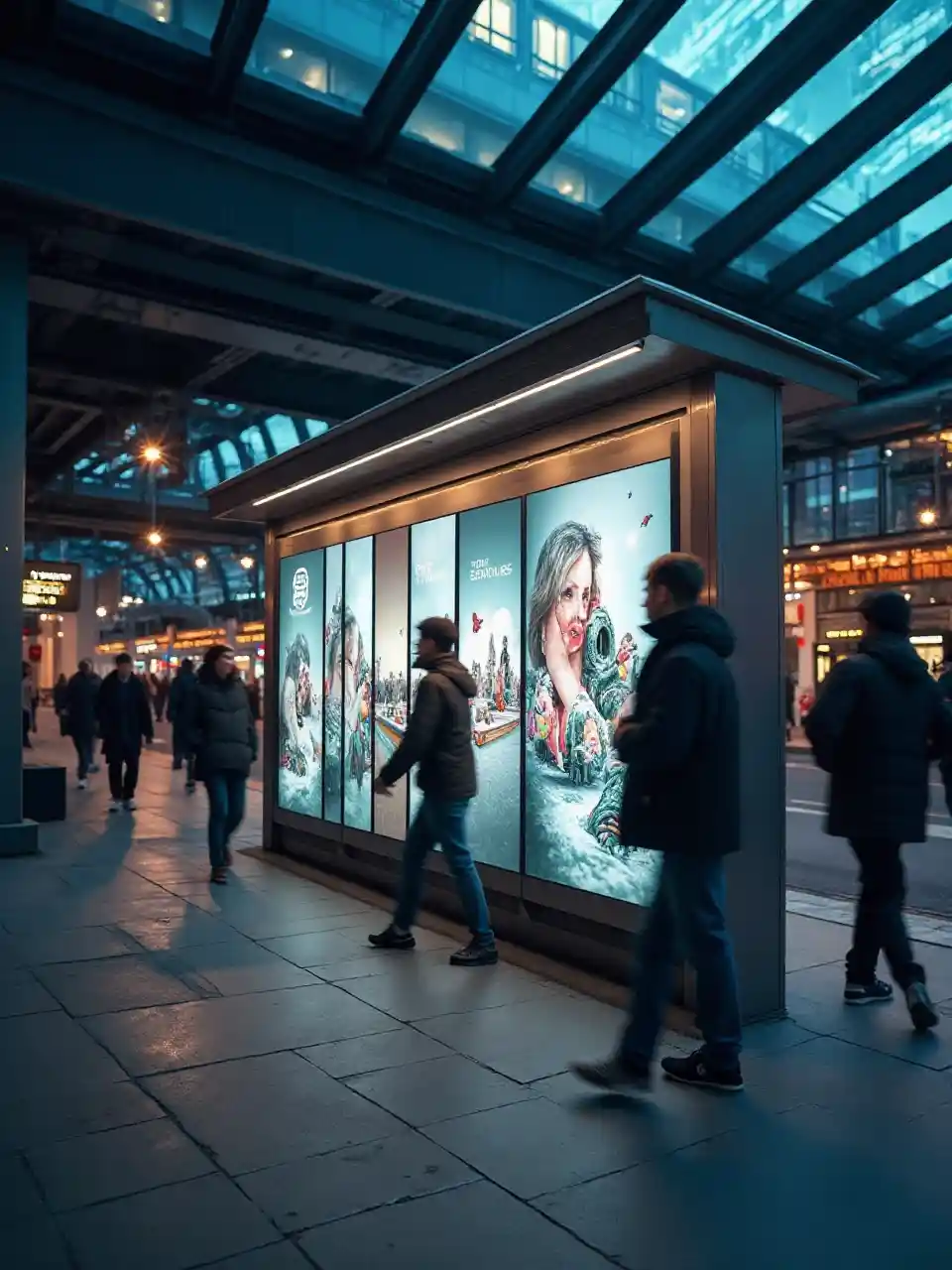 Transit hub billboard showcase. Large-format advertisements on contemporary train platform. Digital displays integrated with architectural elements. Natural light from glass ceiling. People in motion creating dynamic scene. Professional commercial photography." "Smart bus shelter advertising. Interactive digital display panel in modern shelter design. Night scene with illuminated ads. Clean lines with metal and glass construction. Urban environment with traffic light trails. Multiple angles showing ad visibility