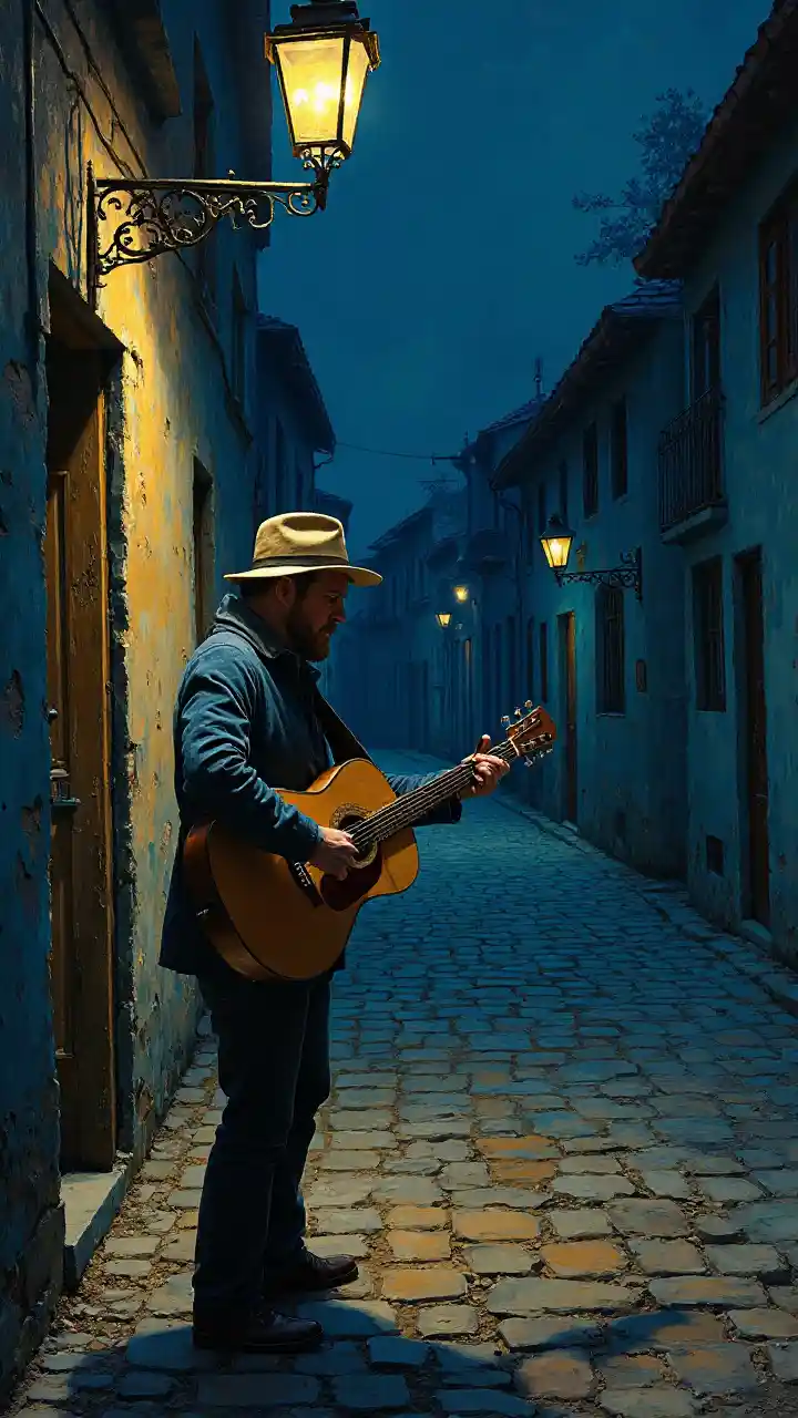 Bentleya Van Gogh painting where the guy plays the guitar on a dark empty street, dark noisy painting