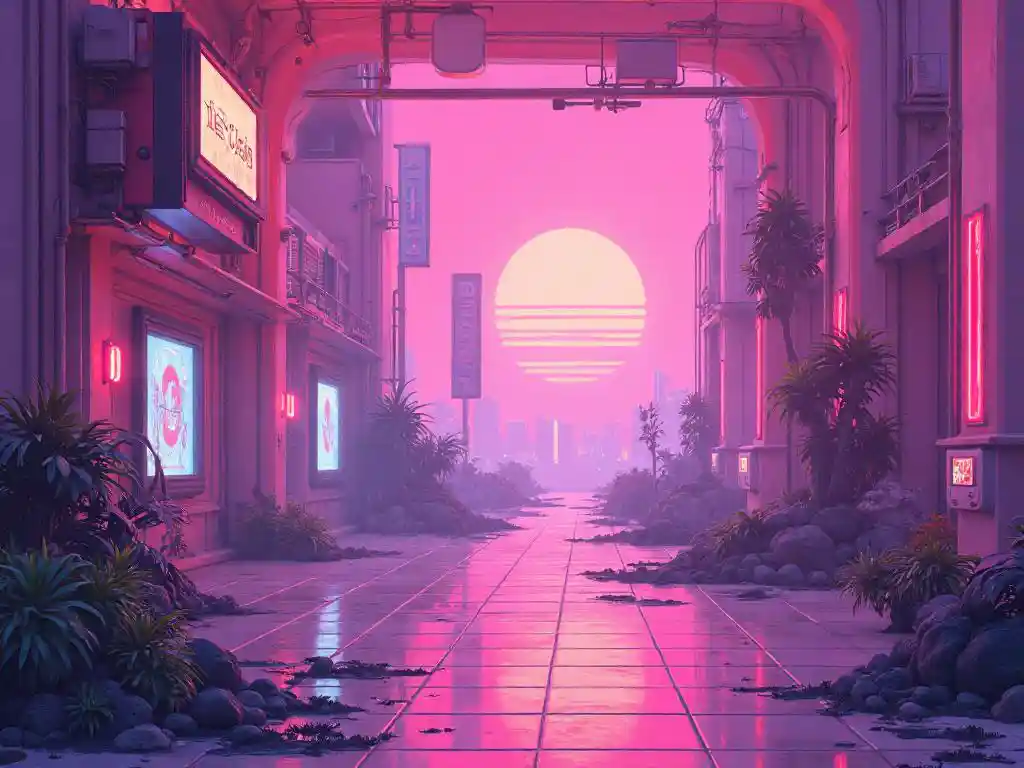 A fantastical worldview based on the theme of "vaporwave," with cyber nostalgia, glitch effects, retro structures, and pink gradations. * Situation: Futuristic