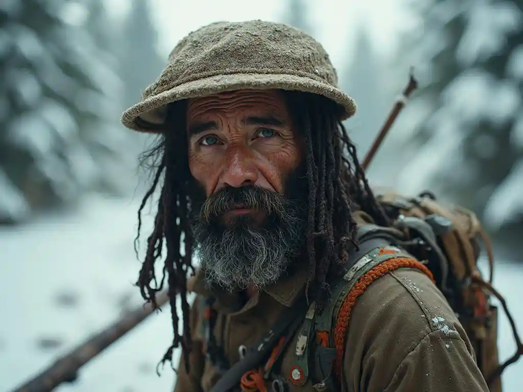CalebA cinematic, hyper-detailed rendering in the style of a South Brazilian-inspired fantasy, depicting a weathered vaqueiro gaúcho (35-45 years old, dark olive ski
