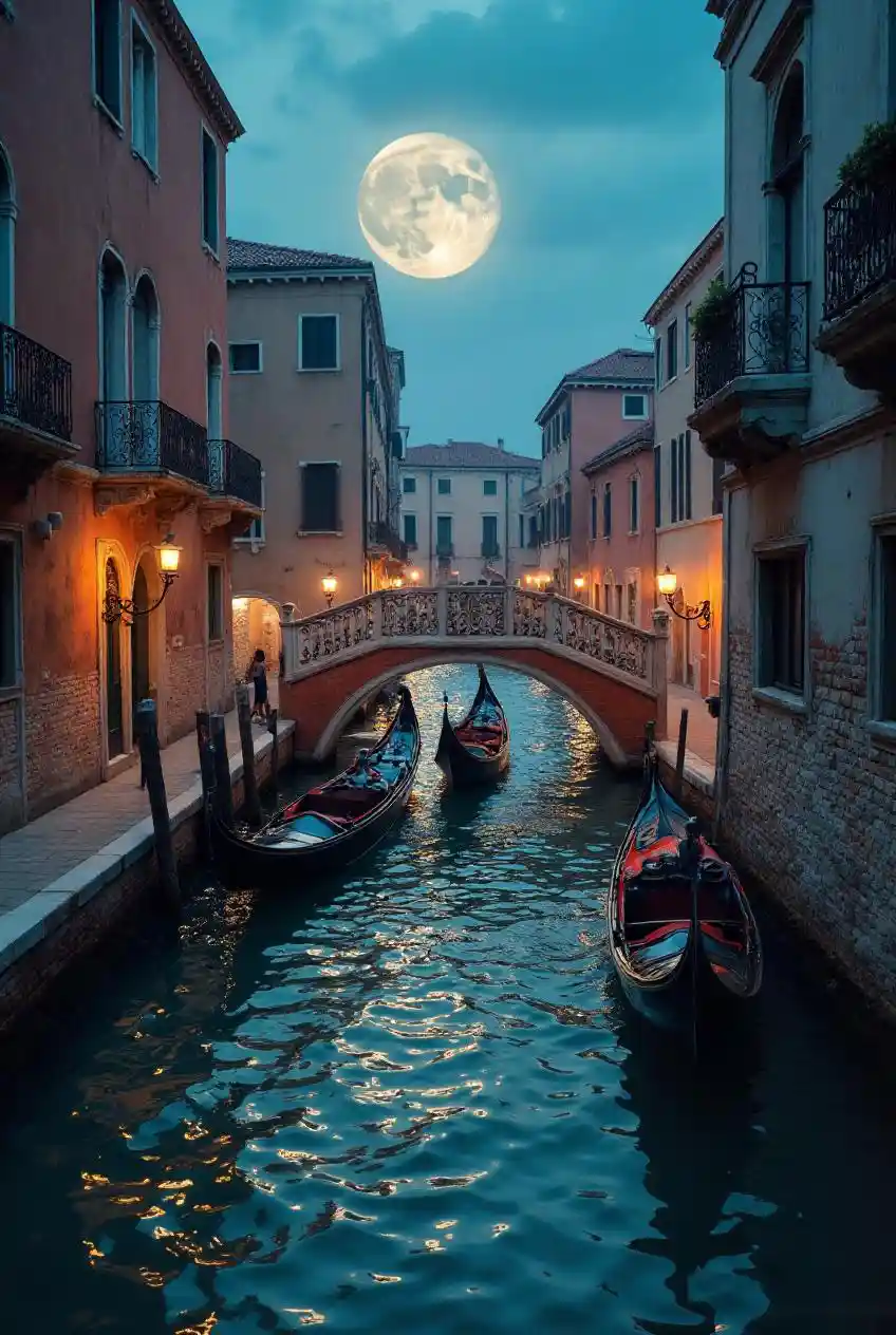Bustling canals of Venice, with gondoliers serenading under moonlit bridges.
